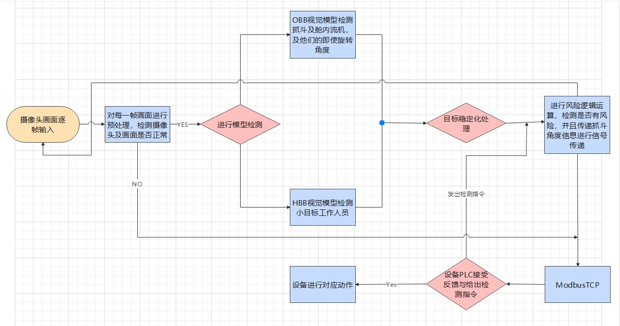 传统会在象鼻梁上安装一个向下俯视的摄像头,但现有视频监控多为人工观察,响应慢、误判率高;部分系统缺乏对旋转目标姿态的感知,无法根据抓斗实时姿态自适应危险区域。