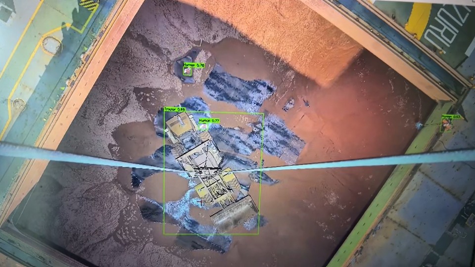 散货装卸作业中,抓斗在船舱内与流机(挖掘机和推土机)、舱内工作人员在作业存在碰撞风险,舱内空间受限、视线遮挡严重,并且传统定点传感器难以覆盖复杂动态场景。